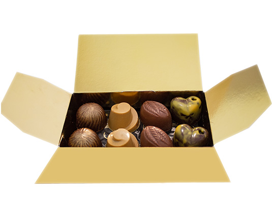 Assortiment de chocolats noirs, au lait ou blonds : ganaches subtiles, onctueux pralinés, traditionnel caramel beurre salé, pâte d’amande parfumée ou pâte naturelle de pistache au goût intense.