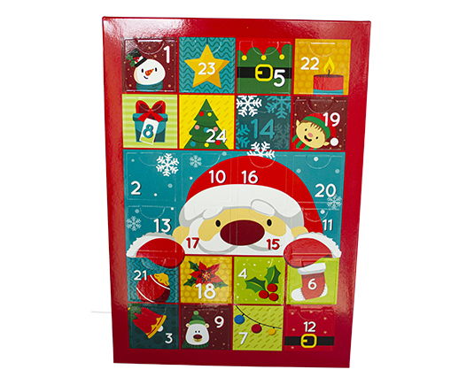 joli calendrier père NOEL sur fond rouge garni de chocolats pralinés et de friandises variées (noisettes enrobées, pâtes de fruits, caramels)